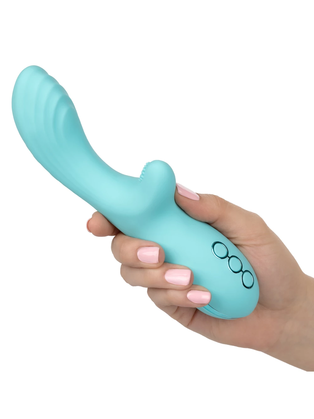 The Catalina Climaxer has both an internal and an external motor which can be independently controlled, giving you total control over your pleasure. You can even mix and match the various modes on either motor! Find a setting you like? The memory chip lets you quickly return to your favorite so you can get right back to business! This varied toy has three buttons to press: one button moves the internal piece, the second button controls the external bit, and the third button activates the Catalina Climaxer’s travel lock! The internal piece will rock you back and forth to orgasm with three levels of tantalizing clockwise/counter-clockwise rotations, stimulating the G-spot in a whole new way! The textured external stimulator teases your sensitive bits with ten different levels of vibration, escalation, AND pulsation that are sure to hit all the spots; between the external stimulation and the rotating internal shaft, who wouldn’t want an extended vacation to Catalina?
