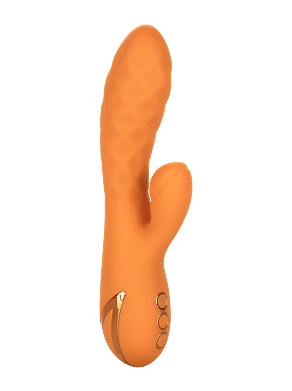 The Newport Beach Babe has both an internal and an external motor which can be independently controlled, giving you total control over your pleasure. You can even mix and match the various modes on either motor! Find a setting you like? The memory chip lets you quickly return to your favorite so you can get right back to business! This pleasure toy has three buttons to press: one button moves the internal piece, the second button controls the external bit, and the third button activates the Newport Beach Babe’s travel lock! The curved internal piece will vibrate you back and forth to orgasm with three levels of tantalizing vibrational patterns, stimulating the G-spot in a whole new way! The textured external stimulator offers a “thumping” sensation which is good for those who prefer more pronounced external stimulation. With ten different levels of vibration, escalation, AND pulsation that are sure to rock all your sweet spots, who wouldn’t want to spend a long day at the beach?