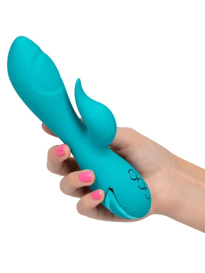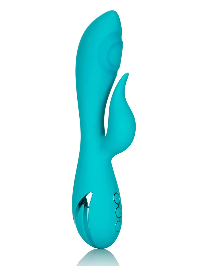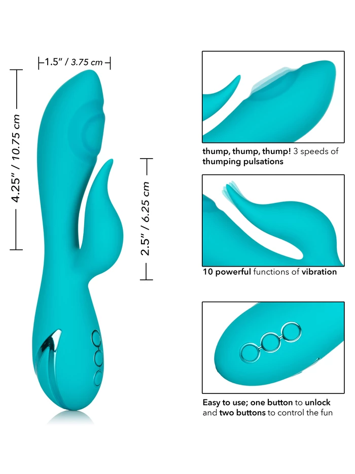 Let this curvy twice-as-nice vibrator make all your California dreams comes true. The smooth tapered shaft offers a unique new ride for your g-spot with three speeds of thumping pulsation. The external flexible flickering teaser offers 10 functions with multiple options for vibration, pulsation and escalation. Control the internal and external stimulation independently to dial in your perfect level of pleasure. Plus it’s equipped with a memory chip that resumes the last function used, so once you find your favorite setting you don’t have to scroll through all the functions the next time you turn it on–you can get with it right away! Equipped with a travel lock too. One button unlocks the toy while two others independently control the internal and external stimulators.
