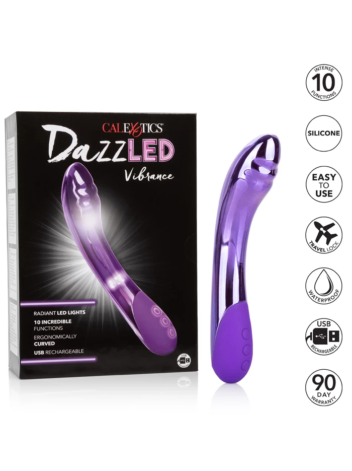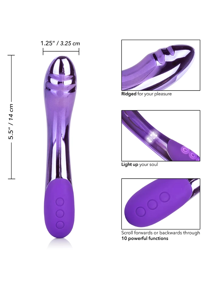 This trusty affordable, USB-rechargeable vibrator will glow right along with you as it pulsates playfully with internal LED lights. Its smooth shaft glows while 10 functions – three levels of vibration and seven pulsation modes—are controlled by an easy-to-use pushbutton. The stimulating curve ends in a textured tip for added sensation. Waterproof and submersible; we recommend using with water-based lubricant.