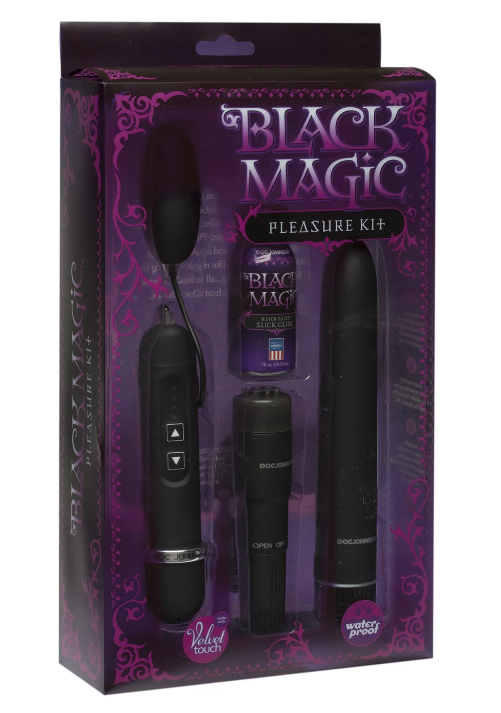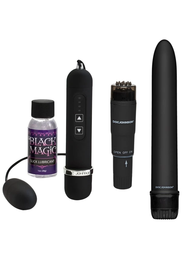 Playtime begins with a twist of noir. Doc Johnson reveals the Black Magic pleasure kit, an impressive collection of silky smooth, Black vibrating pleasure objects that excite and delight. Begin by opening the delightful lubricant and activating the Pocket RocketĀ® for clitoral satisfaction. The ribbed cap intensifies the riveting sensations. Explore the potent possibilities with the incredible bullet/egg vibrator. Classic and elegant, the 7 inch vibrator is a gem to the touch. Guide the twist bottom to reach your choice speed. A trio of whisper quiet vibrations will eclipse your expectations. All three vibrators are waterproof and phthalate free. With plenty of tricks to share, Black Magic leaves you begging for an encore!