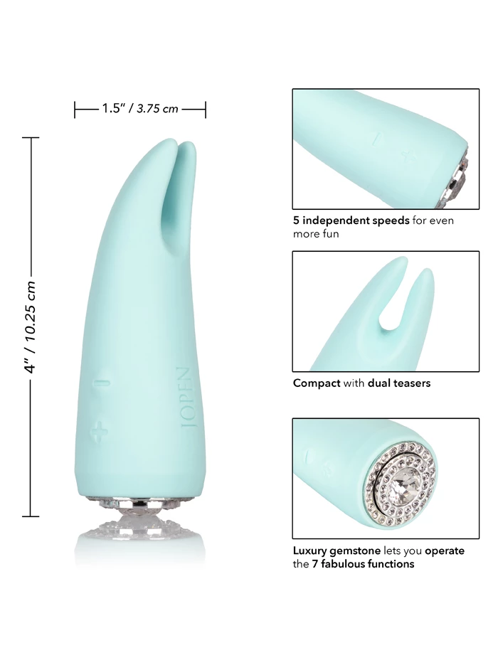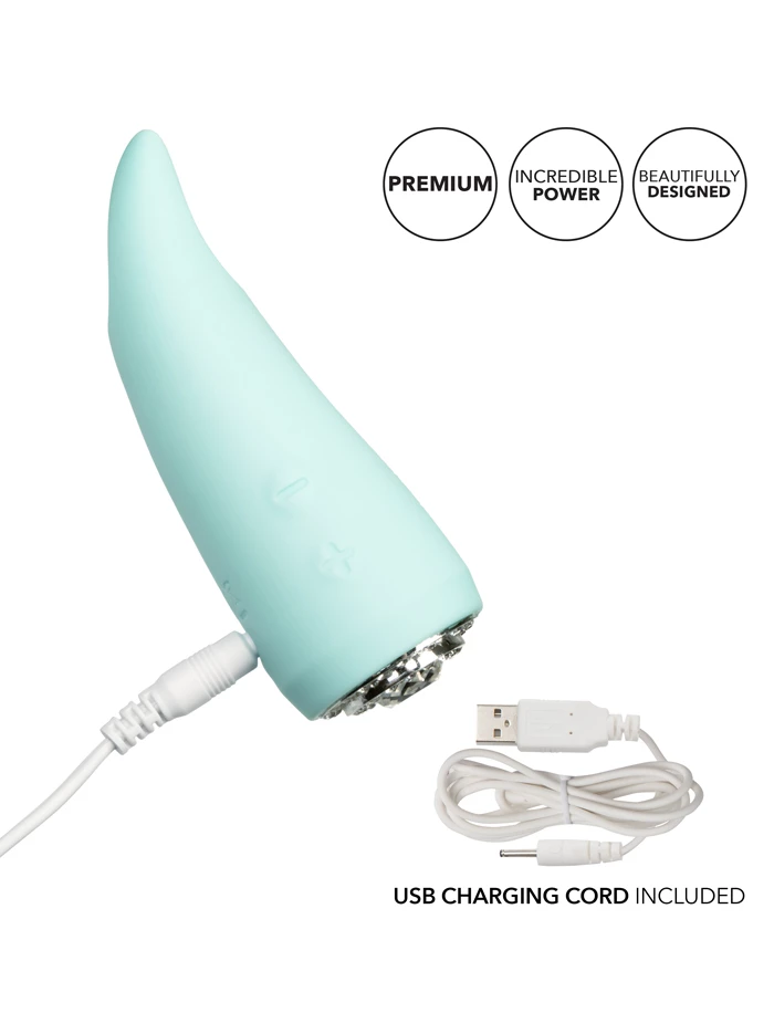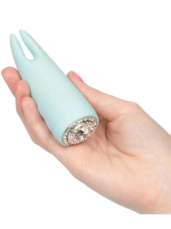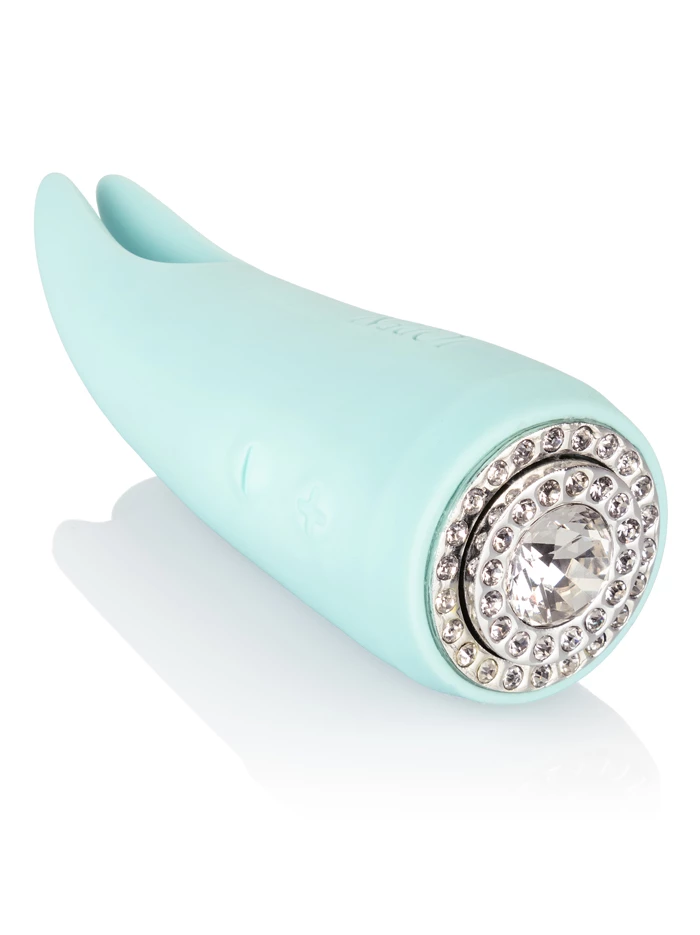A petite shape can disguise powerful sensations! Introducing smooth silicone Diana: its satiny, compact design is well-suited for savoring clitoral vibrations. Its dual teasers can be used for focused, pin-point vibration, or nestle the tips around the clitoris for an encased feel. For a more diffused kind of stimulation, use the smooth sides. With seven functions of vibration, pulsation and escalation to explore, plus five independent speeds for each, Diana lets fans of focused stimulation find their perfect buzz. A gem-shaped push-button control located on the base controls all functions; hold for 3 seconds to turn on, then continue to press until each function is reached. Just press the +/- button, located on the side, to increase or decrease intensity for any given function. To turn off, hold for 3 seconds. USB rechargeable; a two-hour charge yields 40 min of high-speed use. When plugged into its power source, a solid red LED indicates the vibrator is in Charge mode. A white light indicates Diana is fully charged. Waterproof; clean with mild soap and water. We recommend using water-based lubricant.