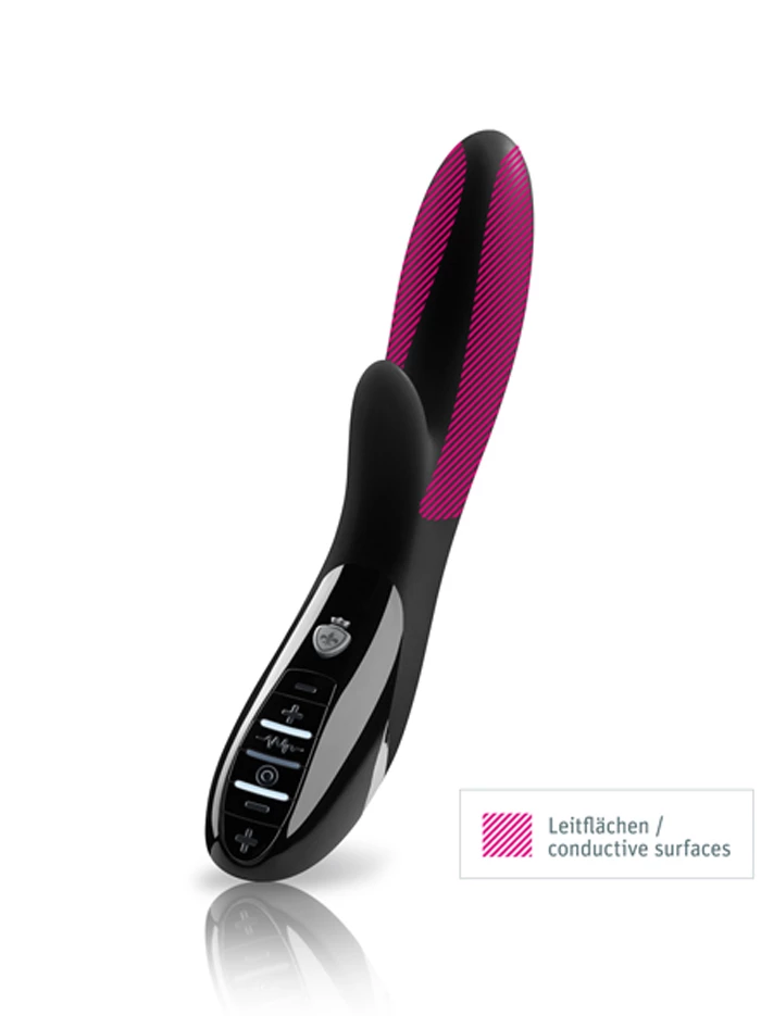 Mystim’s Estim toys are internal vibrators, ready to rock you with one motor in the base and another in the tip, that have a special superpower: they combine their wide range of vibrational patterns with electrical stimulation. E-stim, or electrosex, is the inclusion of electrical impulses during sexual activity–sensations can range from tingly and sensual to substantial intensity. E-stim devices and toys literally speak our body’s electrical language–whenever our bodies experience sensual stimuli, that sensation is transformed to an electrical impulse that travels to our brain as stimulation. And what stimulation electrosex can provide! These toys sport eight vibration patterns, five intensity levels and 10 electric settings–we’re talking serious sensate mathematics! Enjoy over 45 vibration options on their own, or combine them with the electric conductive surfaces that run along the outside shaft and power the toy’s e-stim capabilities. The intuitive controls are easy to navigate and allow for a wide range of variations. Perfect for couples looking to explore light bondage-with-sensation-play, or for a charged-up night on your own, electric stimulation is an excellent way to release endorphins and kick things up a notch.