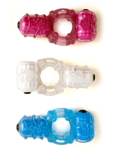 Sensation shared is sensation doubled with the Big O2 Reusable Double Cock Ring. The Double Pleasure ring features dual motors providing twice the sensation for both partners. The vertical vibe features a multi-function 9 stage motor for sensational variety, while the horizontal vibe provides steady, super-powered stimulation. Of course, the vibes are removable for battery changing and cleaning of the sleeve, so feel free to switch them up! No matter which you choose, each vibe holder features a textured surface for extra stimulation. The stretchy material accommodates a variety of sizes and is designed to hug the base of the penis snugly. It’s also waterproof so take it in the tub or shower! Available in clear, blue, and purple assorted colors; please let us choose.