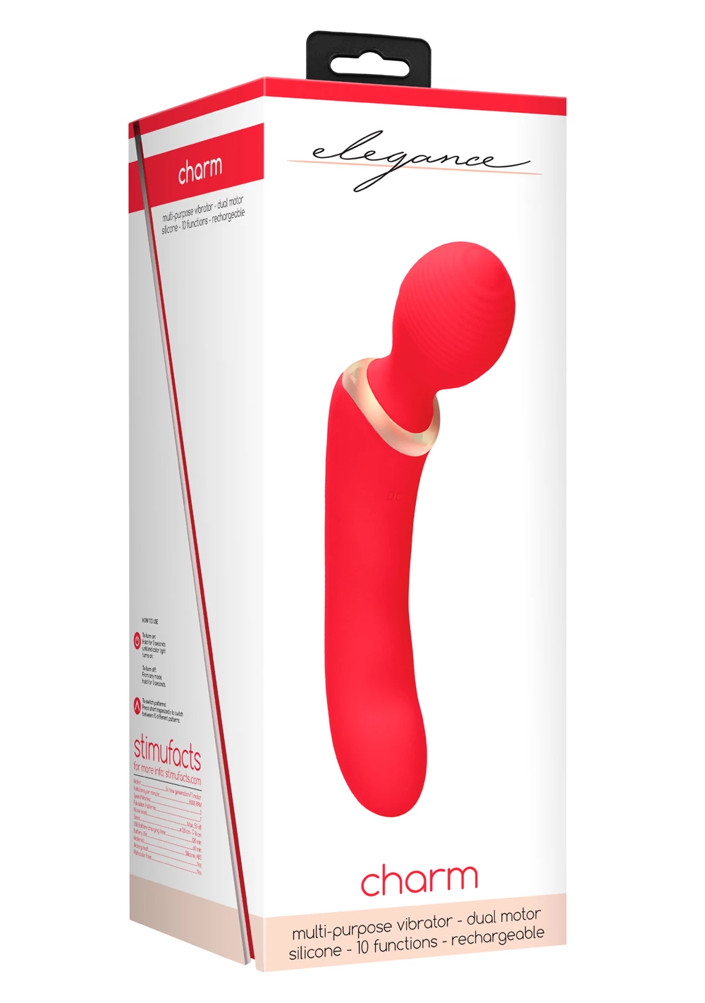 Charm is available in 3 stunning colors: Red, Black and Royal Blue! The two new generation F1 super powerful motors that vibrates at a staggering 8,000 rpm and it features 10 unique vibration functions. The Charm is CE Certified, made from 100% medical grade silicone, waterproof (IP67), extremely quiet and it contains a rechargeable battery that when fully charged with its USB cable will provide 60 minutes of passionate playtime. Just click and charge! The gold-brush finish and extraordinary quality of this toy will make an impression.